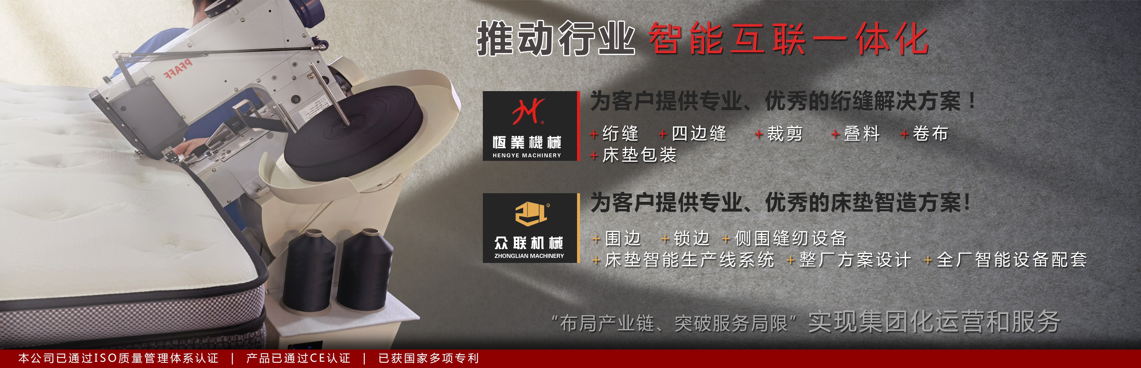 “布局產業鏈、突破服務局限”。聯合“佛山.眾聯機械科技”,實現集團化運營和服務,從原材料到成品床墊入庫的全套智能生產設備及工藝方案,我們可以提供滿格服務,為客戶提供專業、優秀的床墊智造方案。